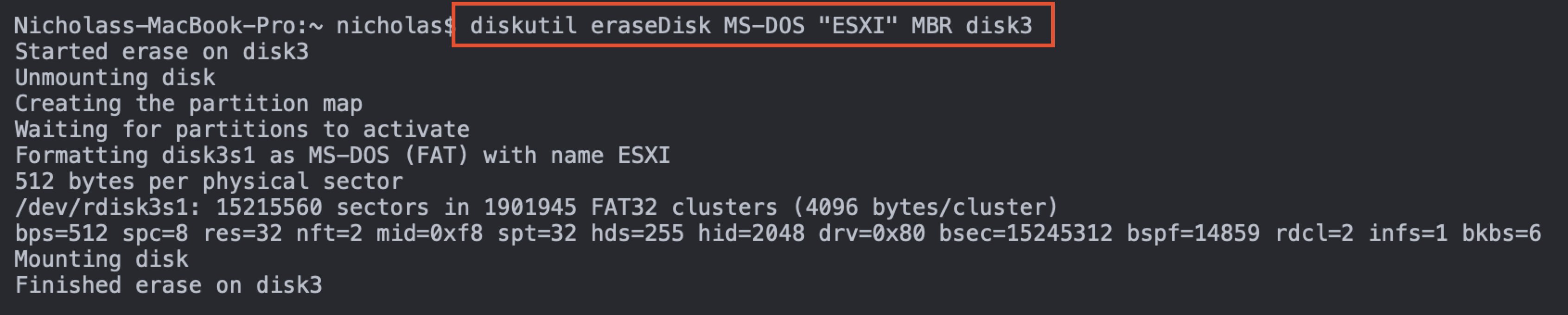 diskutil eraseDisk MS-DOS "ESXI" MBR disk#